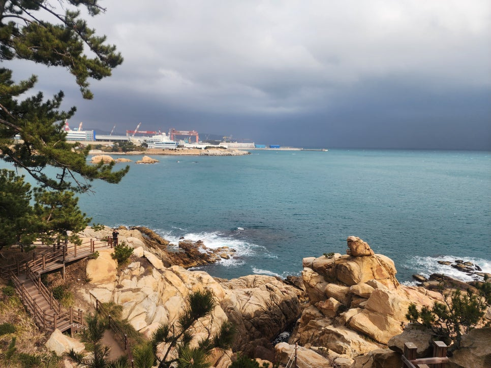 바다 건너에는 조선소가 보인다.